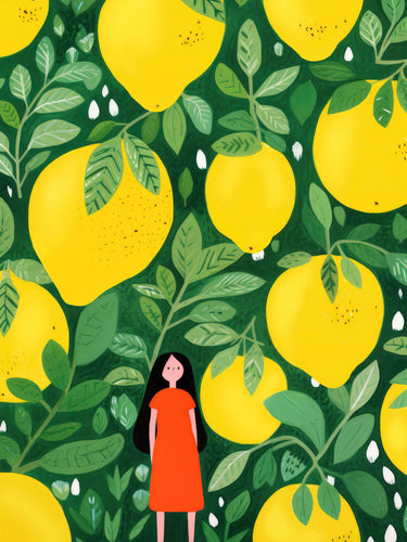 L'image Citronnier fabrique une silhouette dans un jardin de citronnage vivant. La robe rouge sur la figure offre un point focal visuel distinct et crée un contraste de renforcement des yeux avec les citrons jaunes juteux et le feuillage vert luxuriant. C'est une célébration de la beauté et de l'abondance simples de la nature. L'artiste a utilisé un style naïviste qui résume une merveille et une simplicité enfantines. Le travail suinte une joie estivale et invite le spectateur dans un monde où les banalités quotidiennes sont remplacées par une connexion profonde avec la nature.