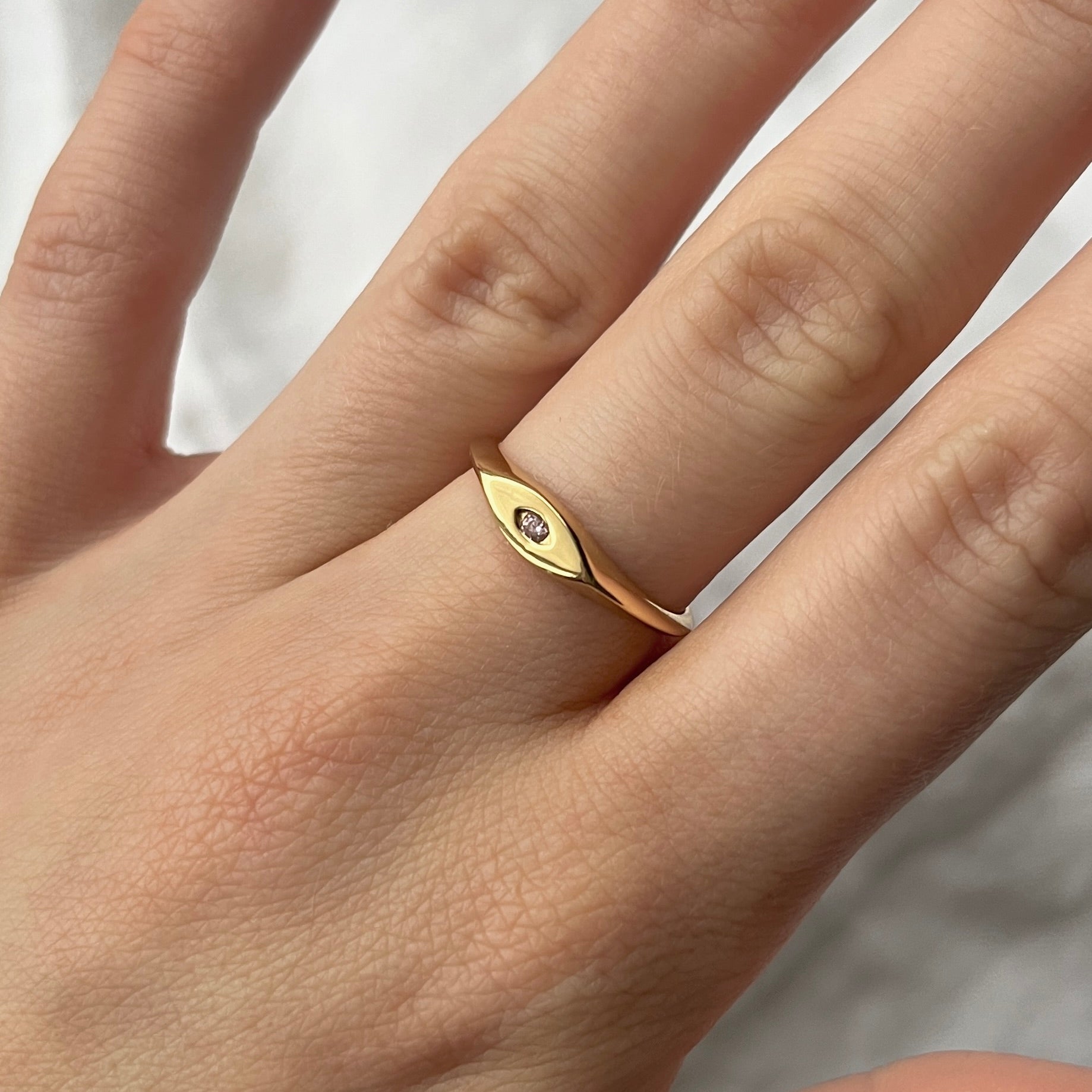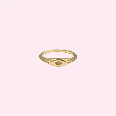 Avec l'anneau Klera, le minimalisme et l'élégance se rencontrent dans un design intemporel. Le milieu de l'anneau a la forme d'un œil et est orné d'un zircon rose étincelant, ce qui donne à l'anneau une expression spéciale. Les lignes épurées en font un choix idéal pour tous les jours ou dans le cadre d'une pile.