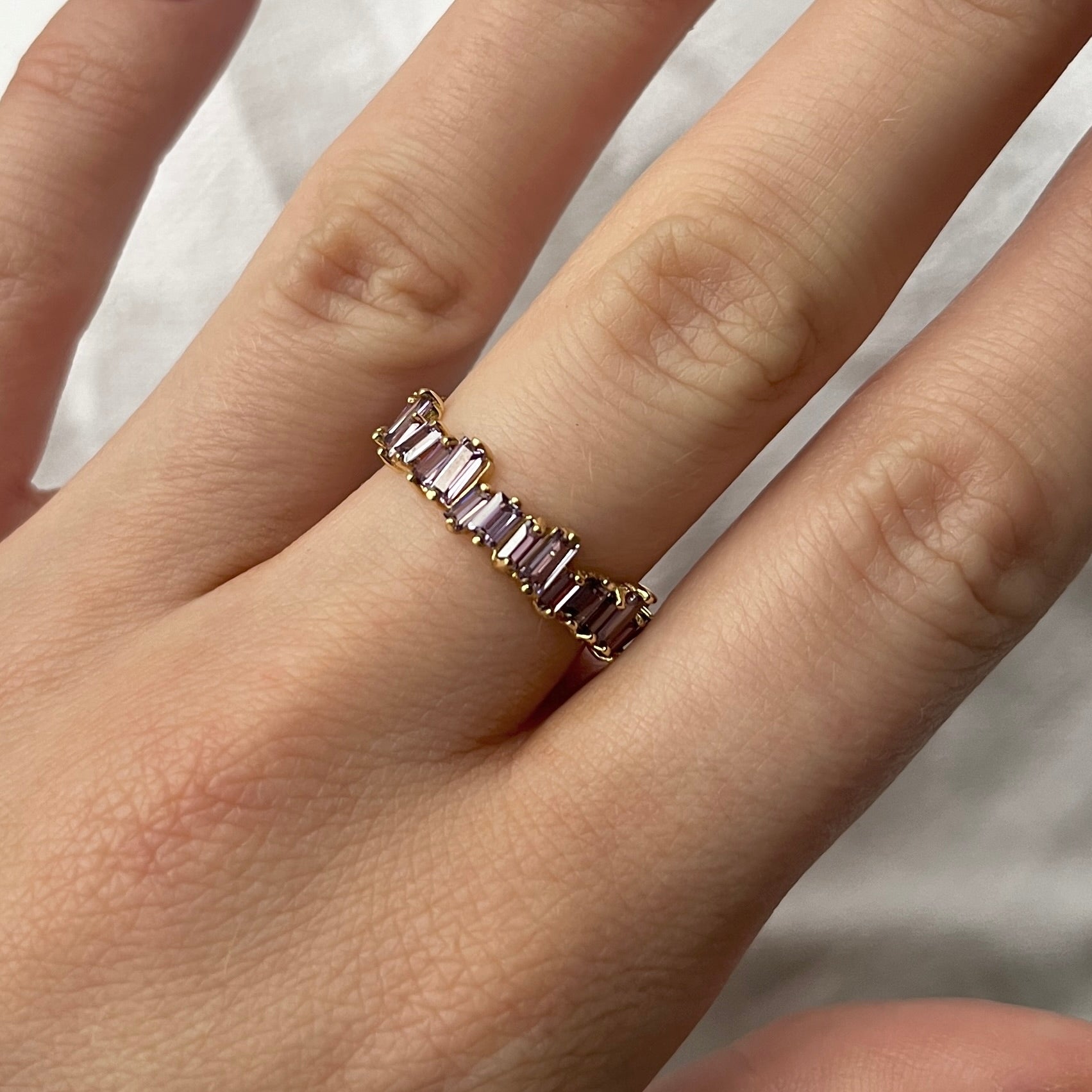 Eterna Ring capture l'essence de l'élégance intemporelle avec ses zircons roses bruts, qui dans une éternité étincelante dansant autour du doigt. Transporter Etherna comme une déclaration solo ou un mélange et assortir avec d'autres anneaux pour un look sophistiqué. L'anneau Eterna se trouve également avec des pierres violettes.