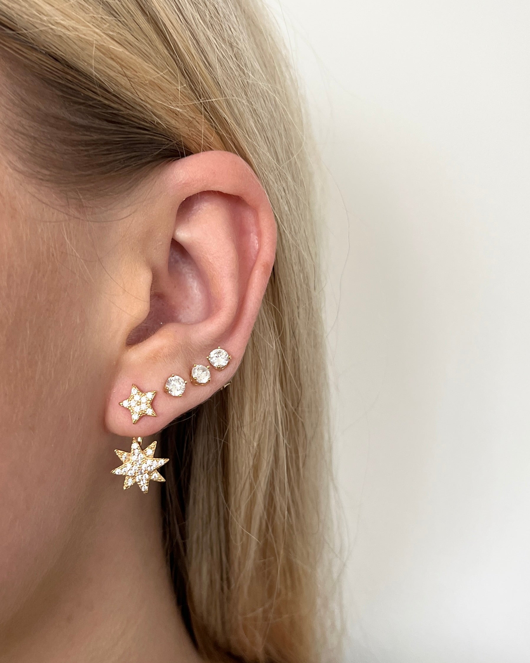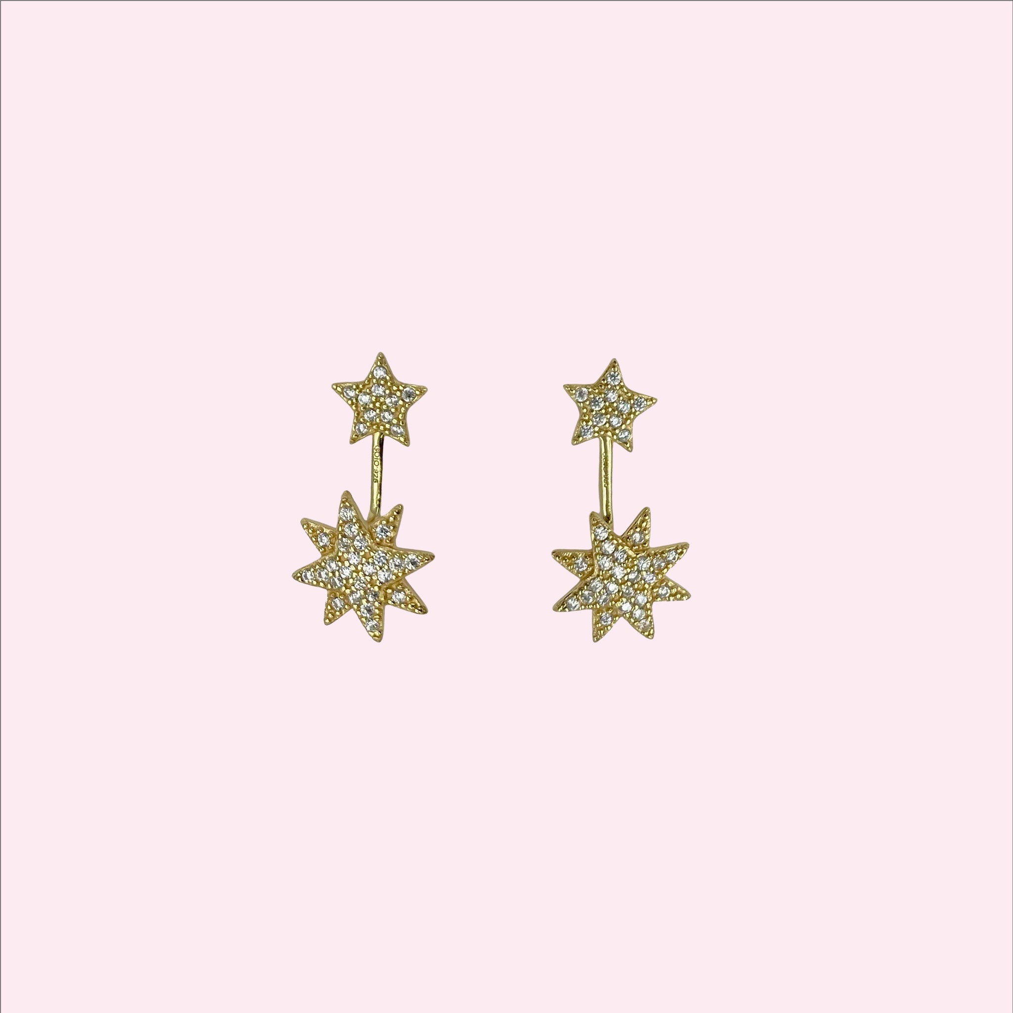 Des mots étincelants, extravagants et angulaires sont des mots qui décrivent les boucles d'oreilles d'estimation. Les boucles d'oreilles sont entièrement les siennes, car l'une des deux étoiles brillantes des bijoux apparaît sous le lobe de l'oreille lorsque les bijoux se trouvent à l'oreille. En plus d'être recouverts de petites pierres scintillantes, les deux étoiles ont une surface inégale qui contribue à un effet scintillant.