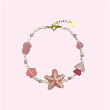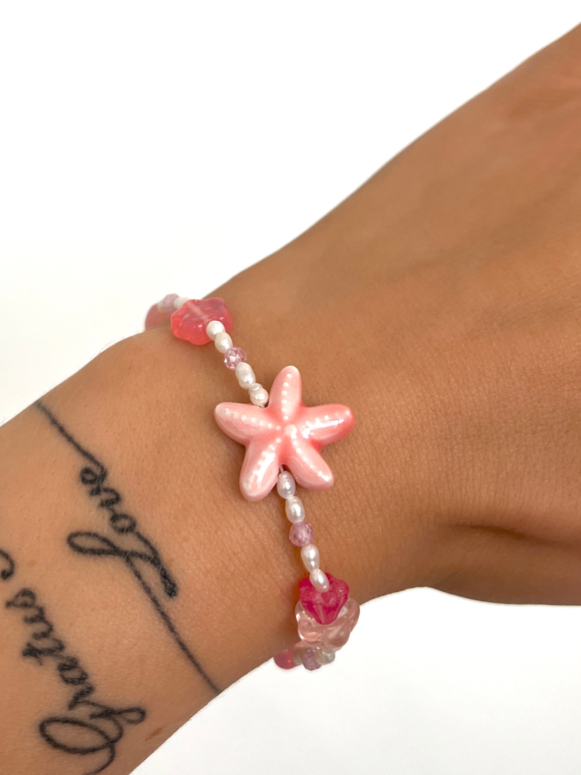 Le bracelet de buzzer rose se compose de belles perles d'eau douce et de perles de verre dans les plus belles nuances roses et roses. Les fleurs et les étoiles de mer font embrasser le bracelet de la magie estivale