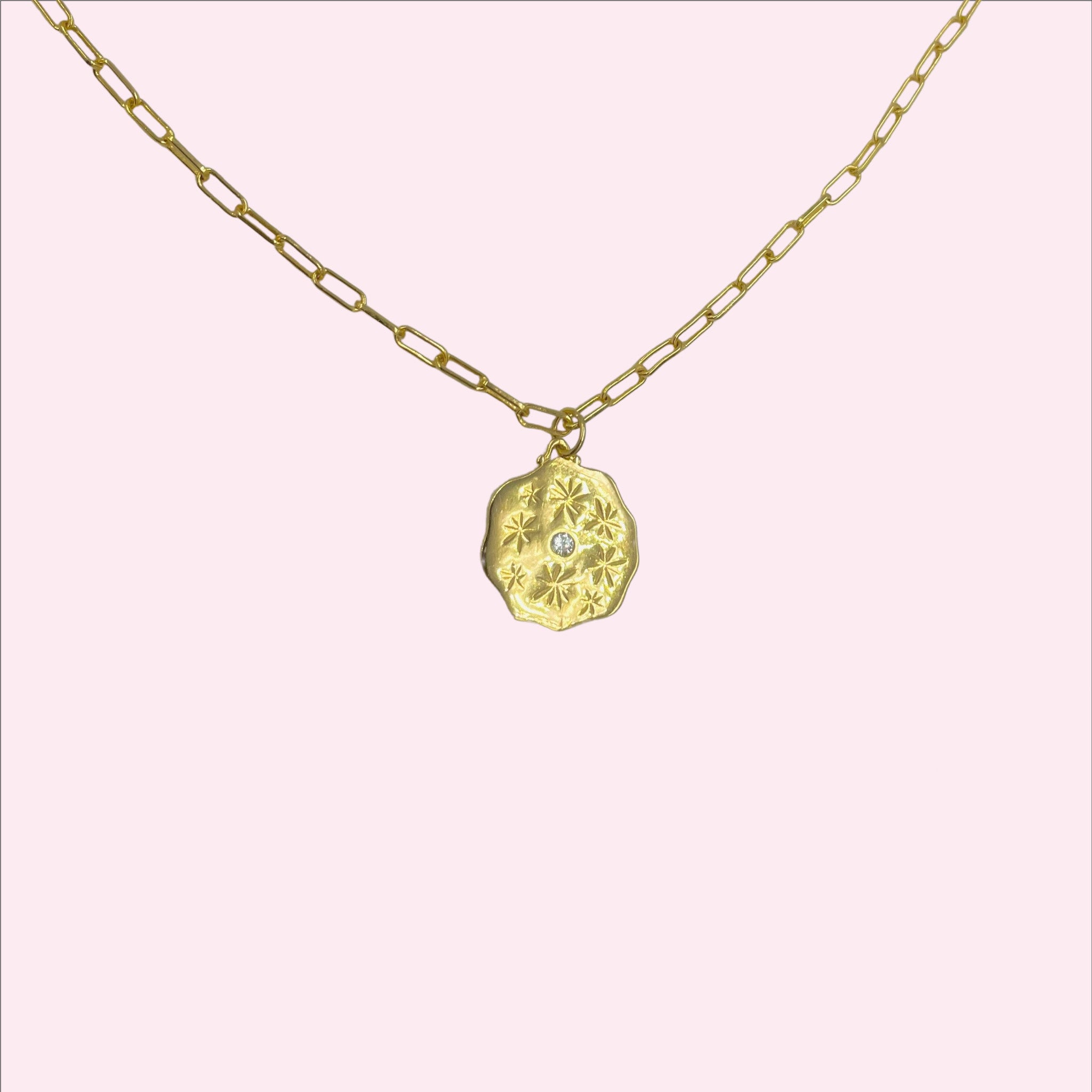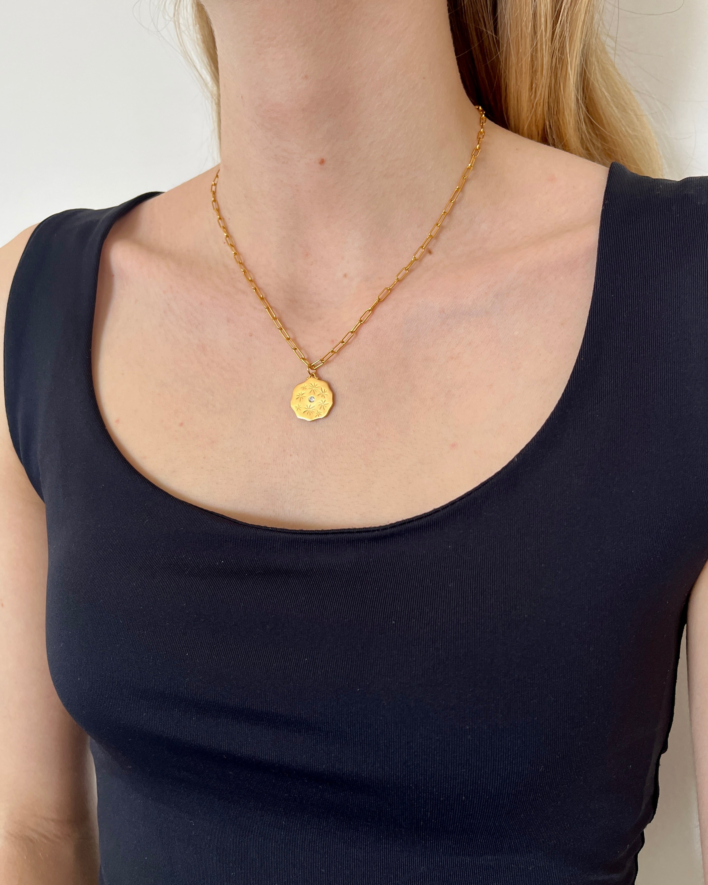 Le collier Fortika a un pendentif frappant, mystérieux et aventureux en même temps. Le pendentif rond est rustique à la surface et au bord. Au milieu du pendentif se trouve une pierre claire entourée de petites étoiles gravées. De cette façon, le collier Fortika rappelle un ciel étoilé où certaines étoiles brillent plus claires que d'autres.