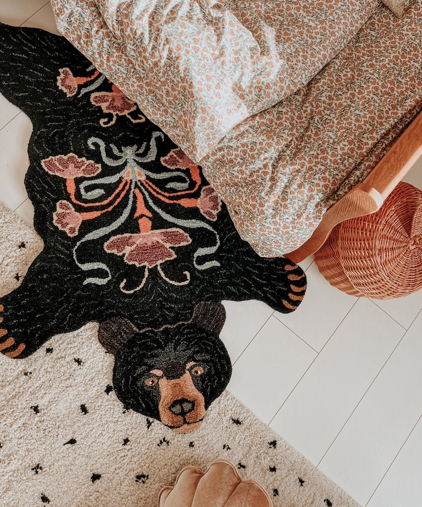 La méthode de fabrication tissée à la main garantit que chaque tapis a son propre caractère unique. Les propriétés naturelles de la laine confèrent au tapis une bonne isolation et une bonne durabilité, ce qui en fait un ajout durable à votre maison. La décoration florale détaillée de l'ours ajoute un élément ludique et artistique à votre décor.