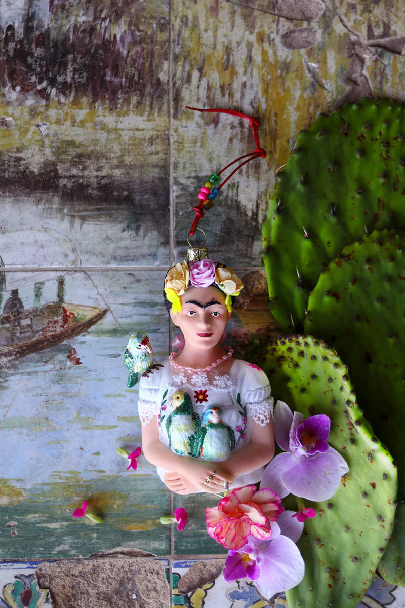 Dette smukke ornament af Frida Kahlo med papegøjer tilføjer en farverig og kreativ dimension til dit hjem. Det er perfekt til at pynte juletræet, men kan også bruges som en dekorativ detalje hele året rundt.