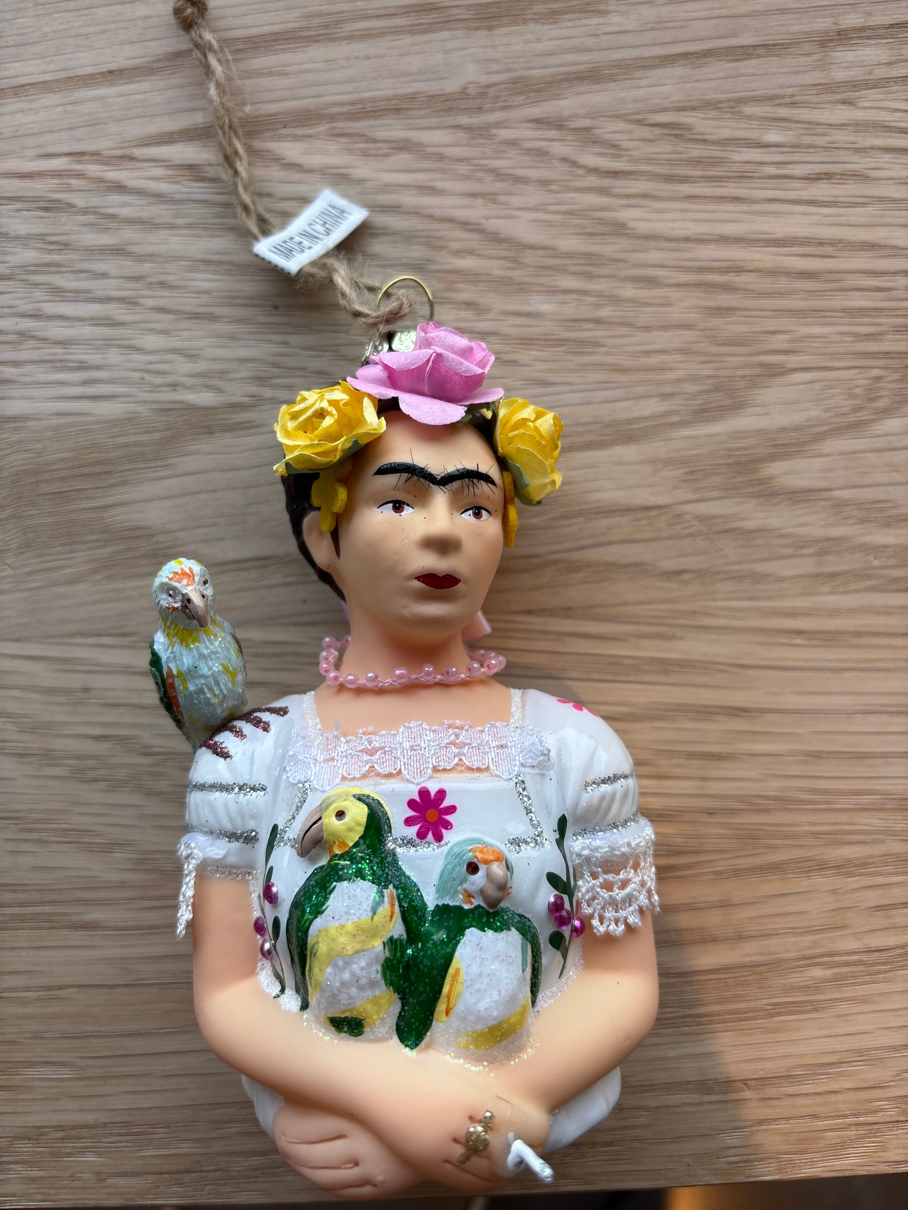 Cette décoration colorée Frida Kahlo avec des perroquets est en verre et mesure 11,4 cm de hauteur. L'œuvre d'art peinte à la main de Cody Foster est conçue en s'inspirant de l'artiste mexicain de renommée mondiale et peut être utilisée à la fois comme décoration de Noël et comme détail artistique dans la maison tout au long de l'année.