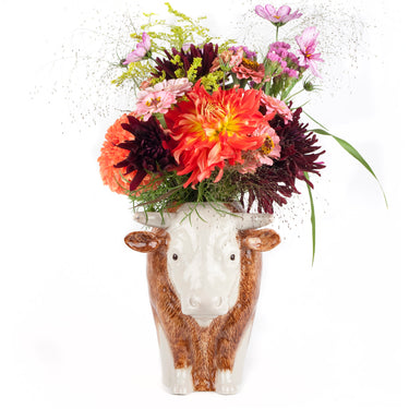 Tilføj et strejf af personlighed til dit hjem med denne unikke vase fra Quail. Den skønne hereford tyr vase er håndmalet i stentøj, hvilket betyder, at hver vase er helt unik med sine egne farvenuancer. Uanset om den står alene eller prydes med blomster, vil den uden tvivl sætte et smil på læben hos dine gæster.