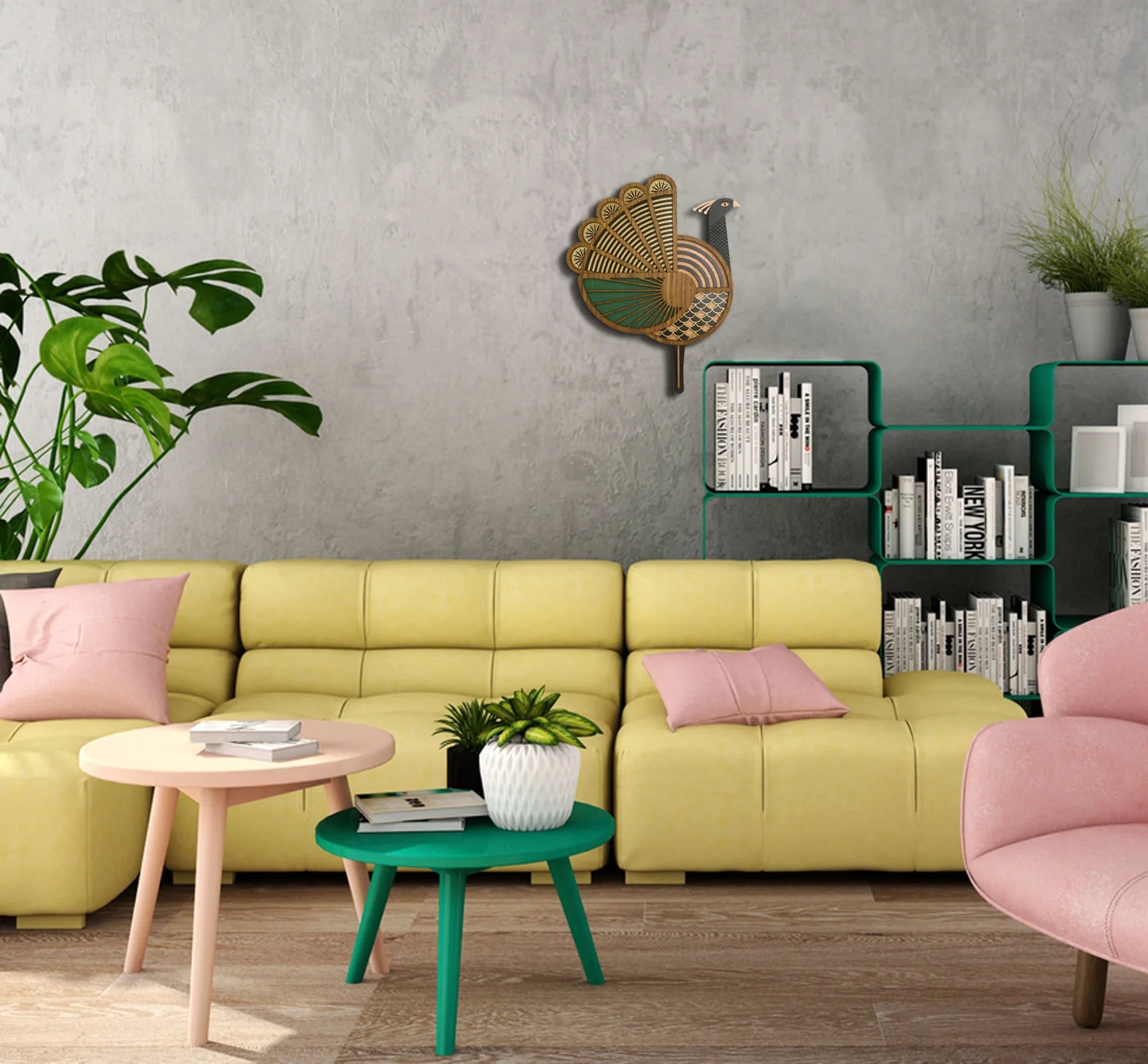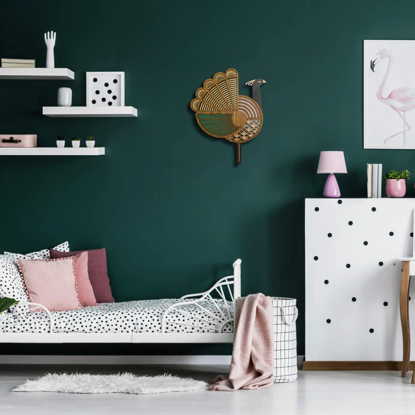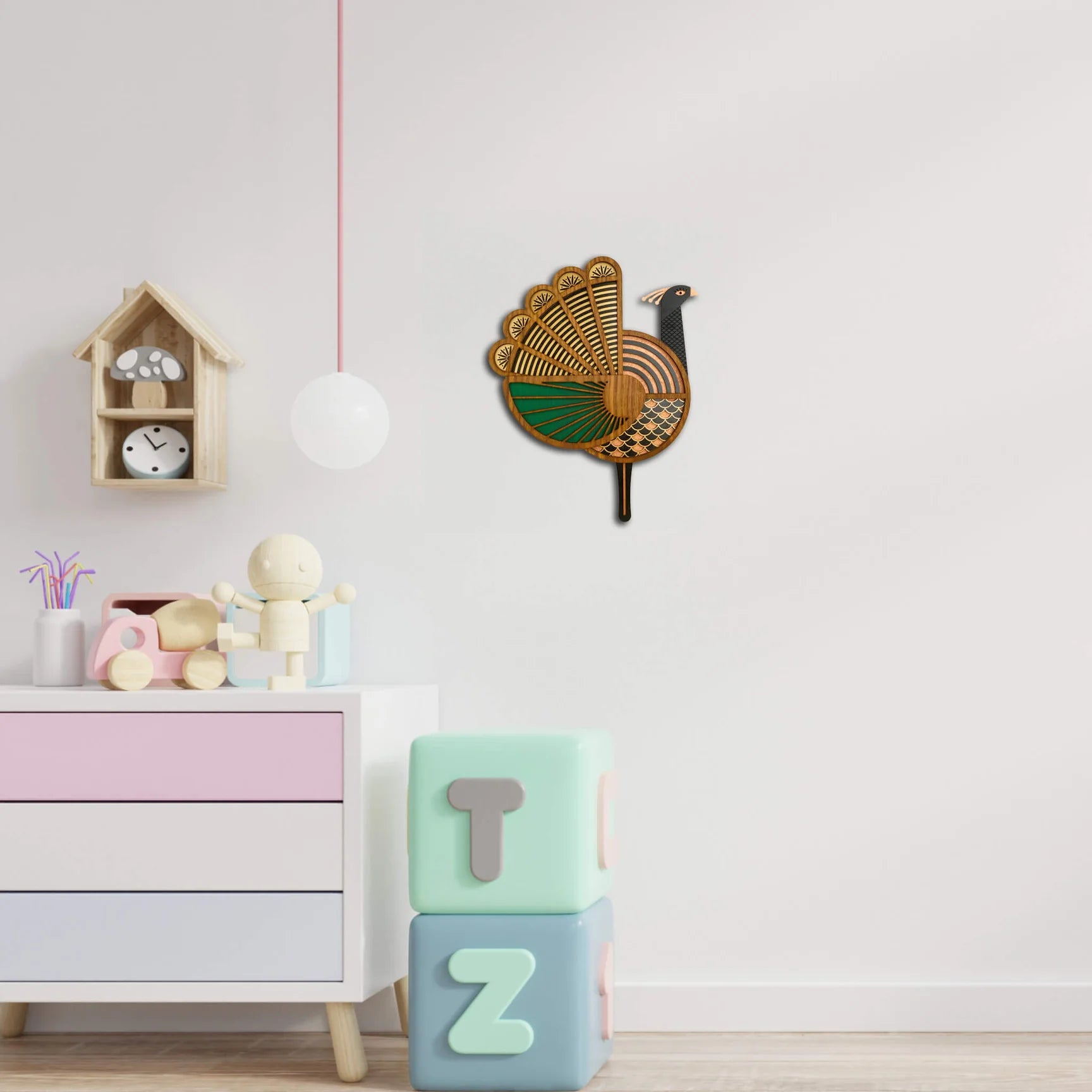 Décoration murale en bois représentant un paon, fabriquée à la main