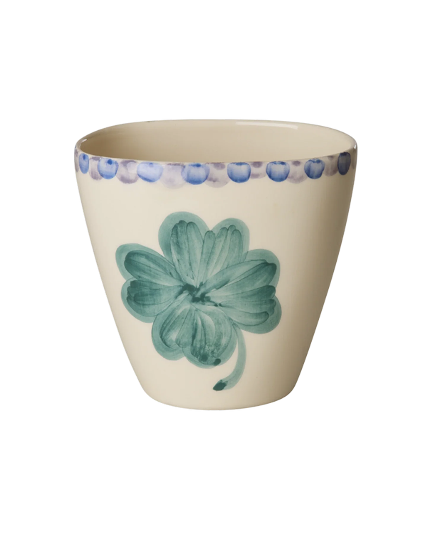 Oplev den helt særlige charme ved denne ovale kop med et håndmalet motiv af et heldigt firkløver. Hver kop er omhyggeligt håndmalet af talentfulde portugisiske kvinder, hvilket gør hver enkelt kop unik og fuld af personlighed.
