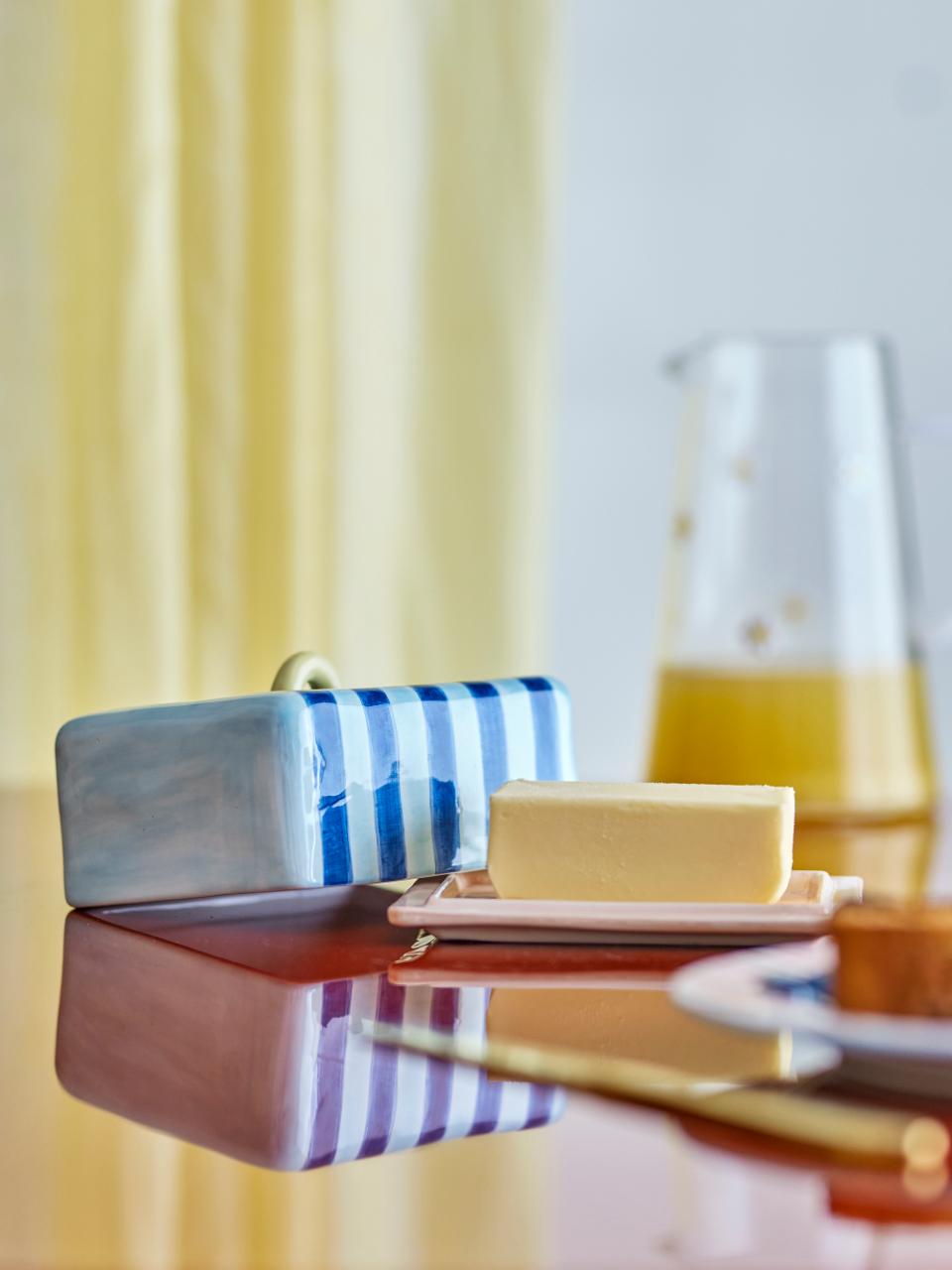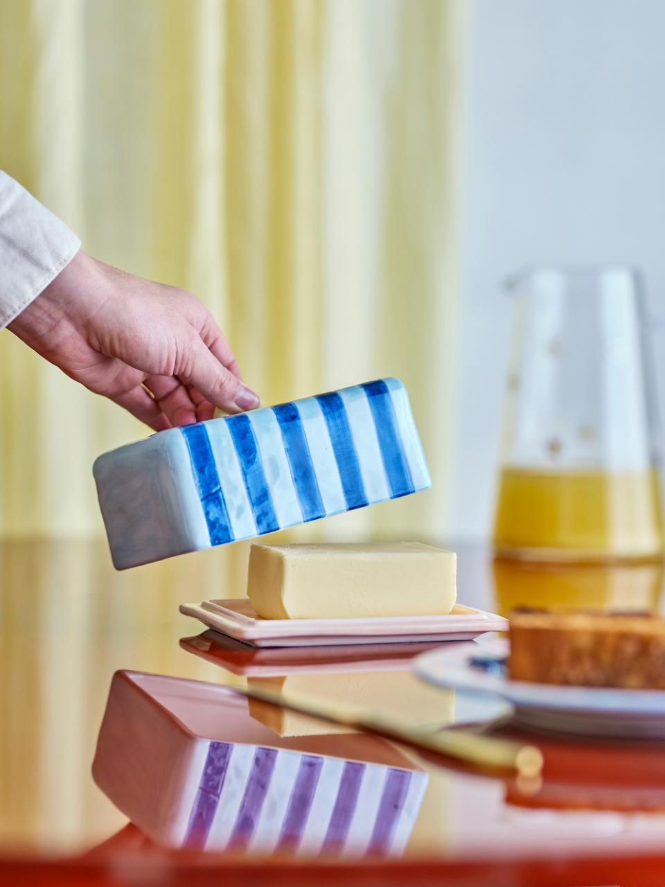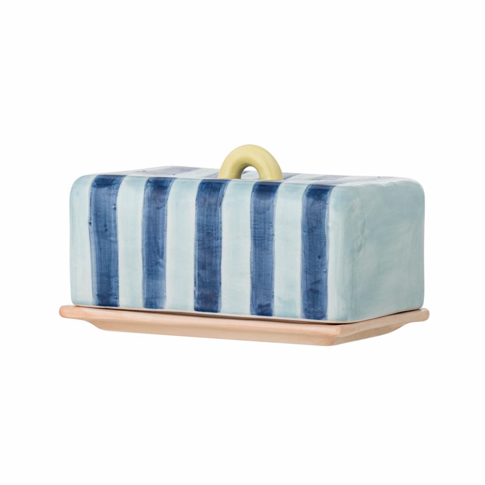 Apportez une touche d'élégance à votre petit-déjeuner avec ce beurrier de Bloomingville. Sa surface peinte à la main et son vernis brillant lui confèrent un aspect luxueux, tandis que son motif rayé lui donne une touche moderne. Chaque beurrier est unique, avec de légères variations dans le motif et l'intensité des couleurs, ce qui en fait un élément personnel sur votre table.