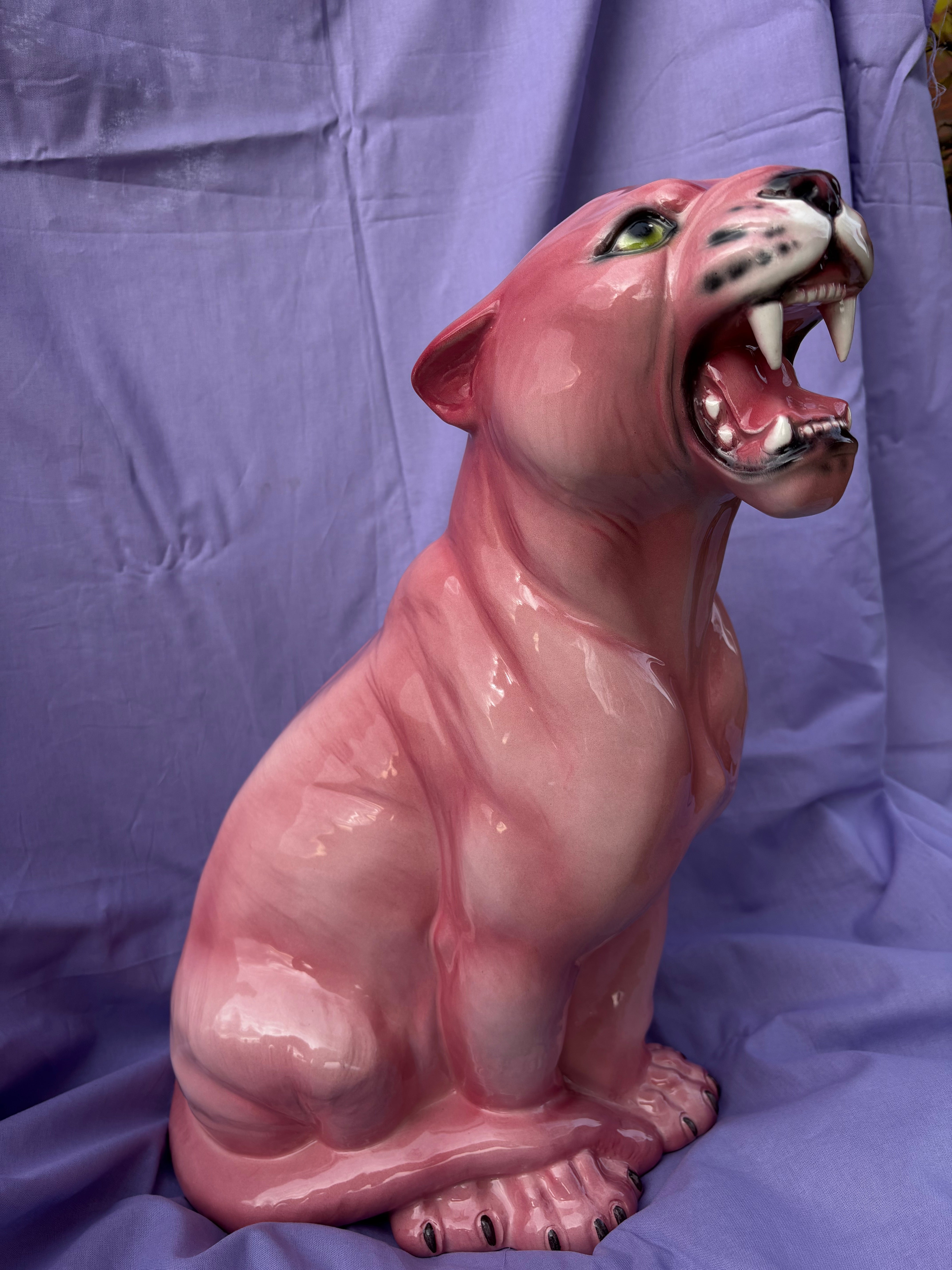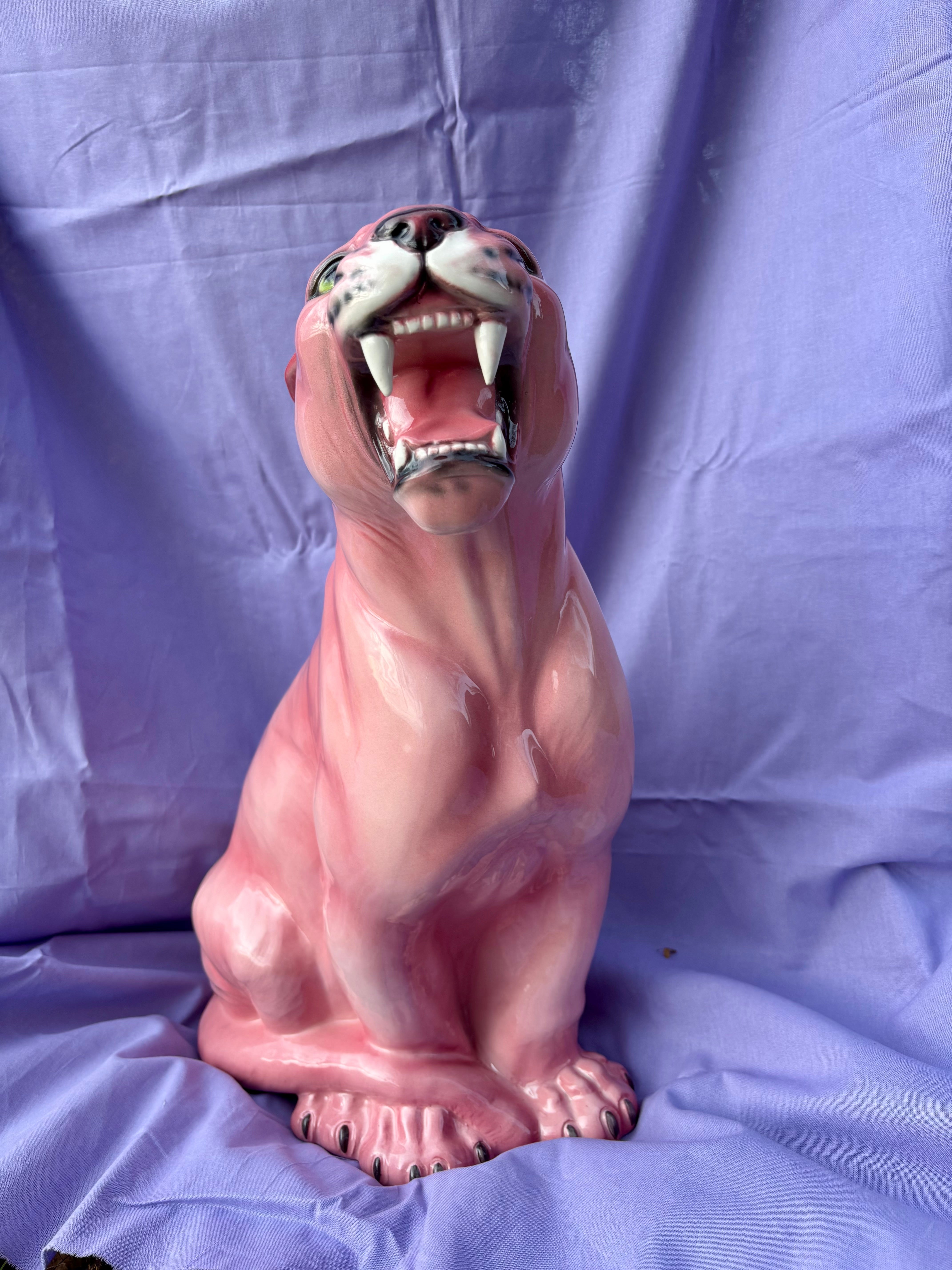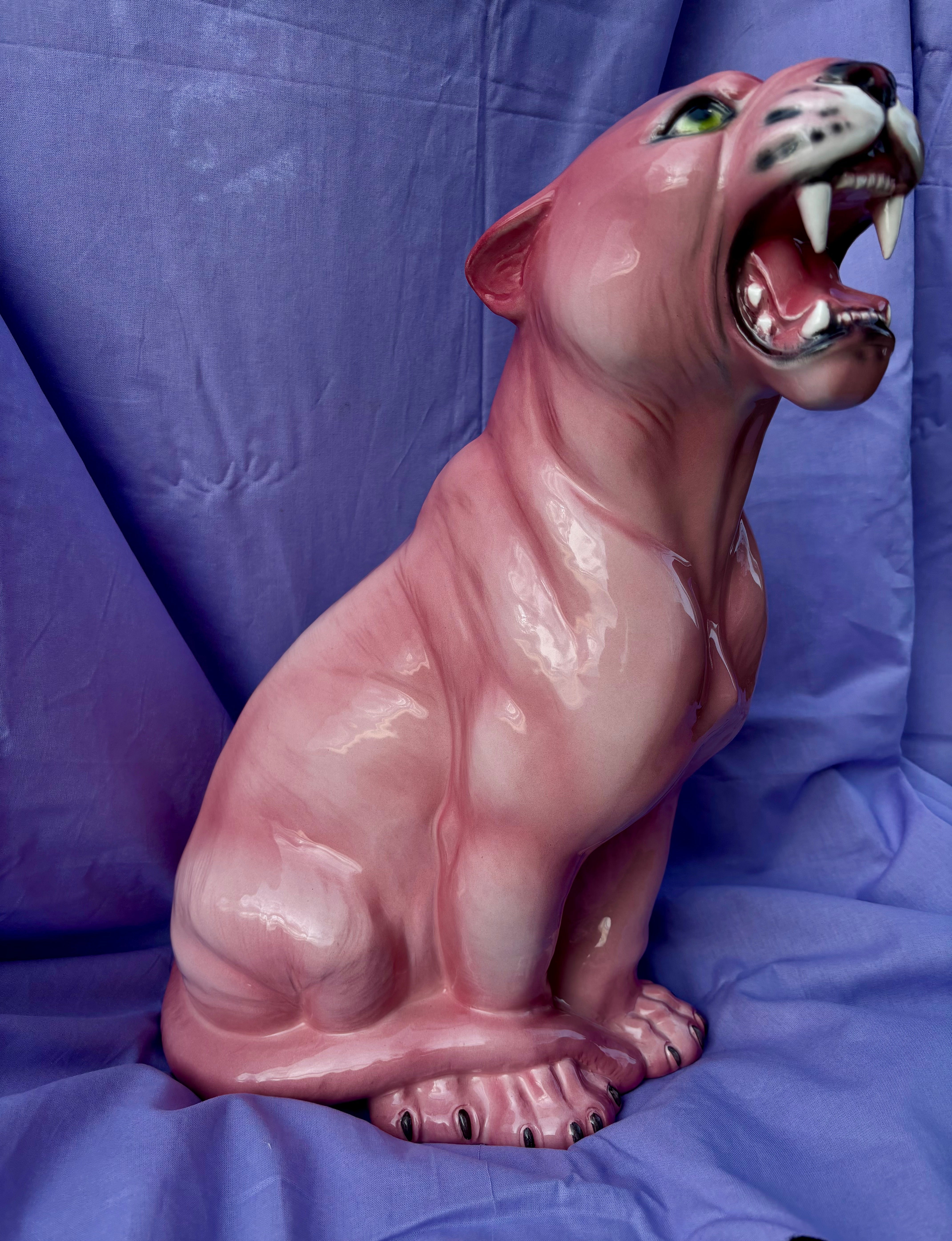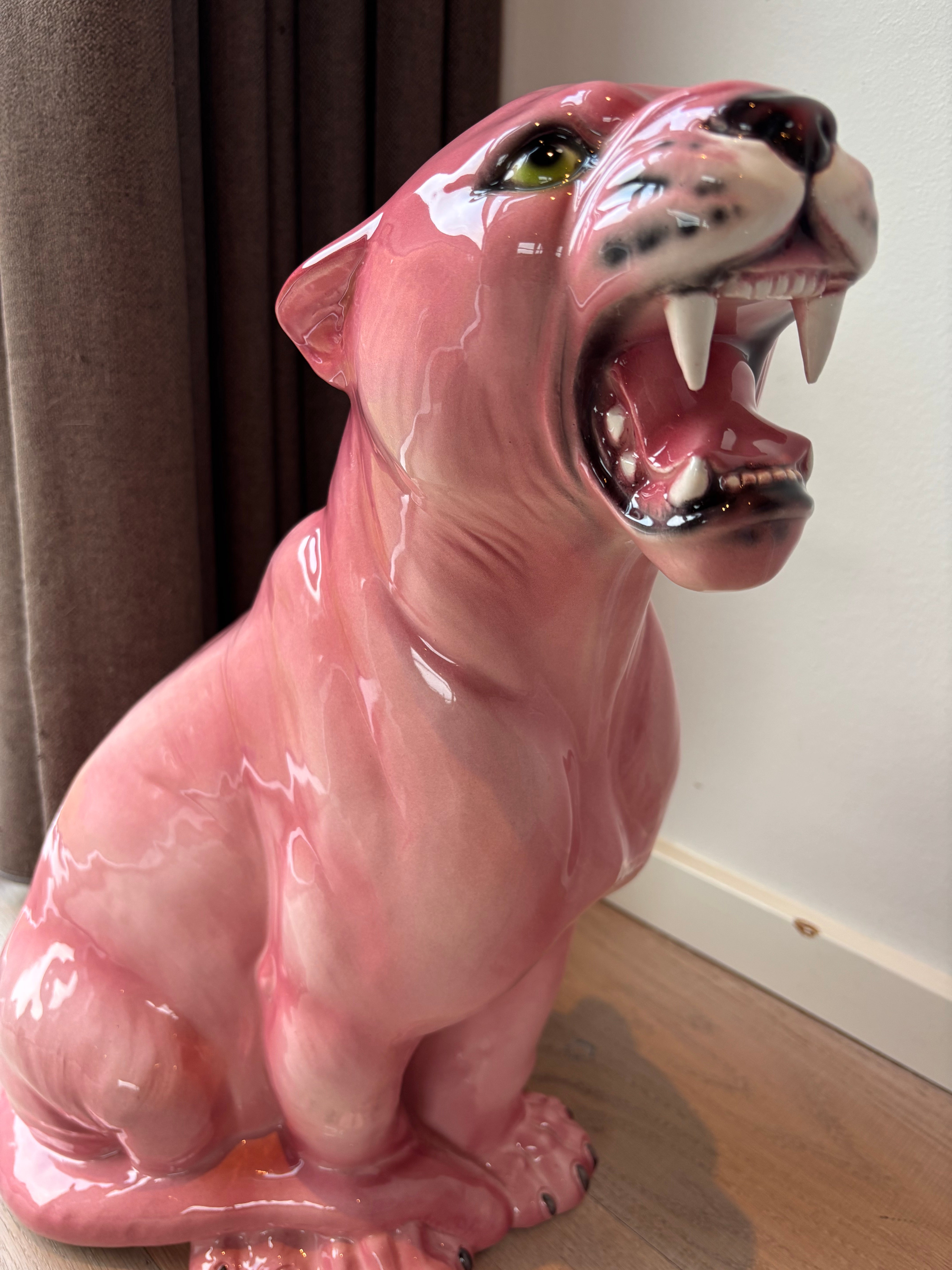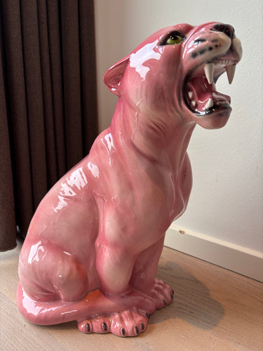 Denne imponerende porcelænsfigur af en pink panter er et markant indretningselement til hjemmet. Med sine 45 cm i højden er figuren håndmalet i Italien med omhyggelige detaljer, der giver et naturtro udtryk trods den utraditionelle farve. De lyserøde nuancer kombineret med den åbne mund og skarpe tænder skaber et karakteristisk udtryk.