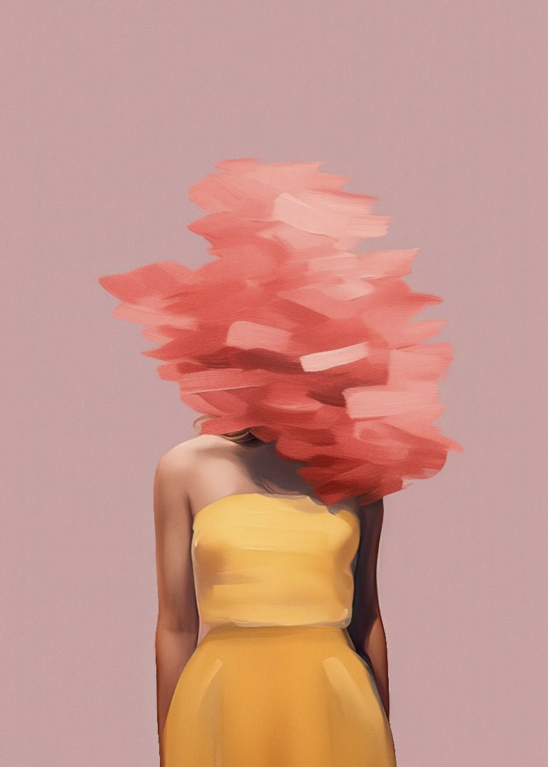 Lady Paint 01 est une présentation de la féminité et du mystère. Sur l'image se dresse une silhouette pour femmes avec une cascade de coups de pinceau rose rougeâtre couvrant son visage et sa tête. Cet effet crée un sentiment de mouvement et de fluidité, presque comme si ses pensées et ses sentiments s'écoulent et deviennent visibles. Le fort contraste entre le fond rose doux et pastel et la robe jaune lumineuse met en évidence la silhouette de la femme. Dans l'ensemble, l'affiche combine des éléments minimalistes avec des couleurs puissantes pour créer une image à la fois rêveuse et enracinée dans les émotions.