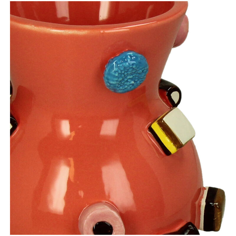 De slik-inspirerede dekorationer giver vasen karakter og gør den til et samtalestykke i hjemmet. Vasens røde grundfarve kombineret med de farverige elementer skaber et visuelt interessant fokuspunkt, der kan tilføje liv til både moderne og klassiske indretningsstile.