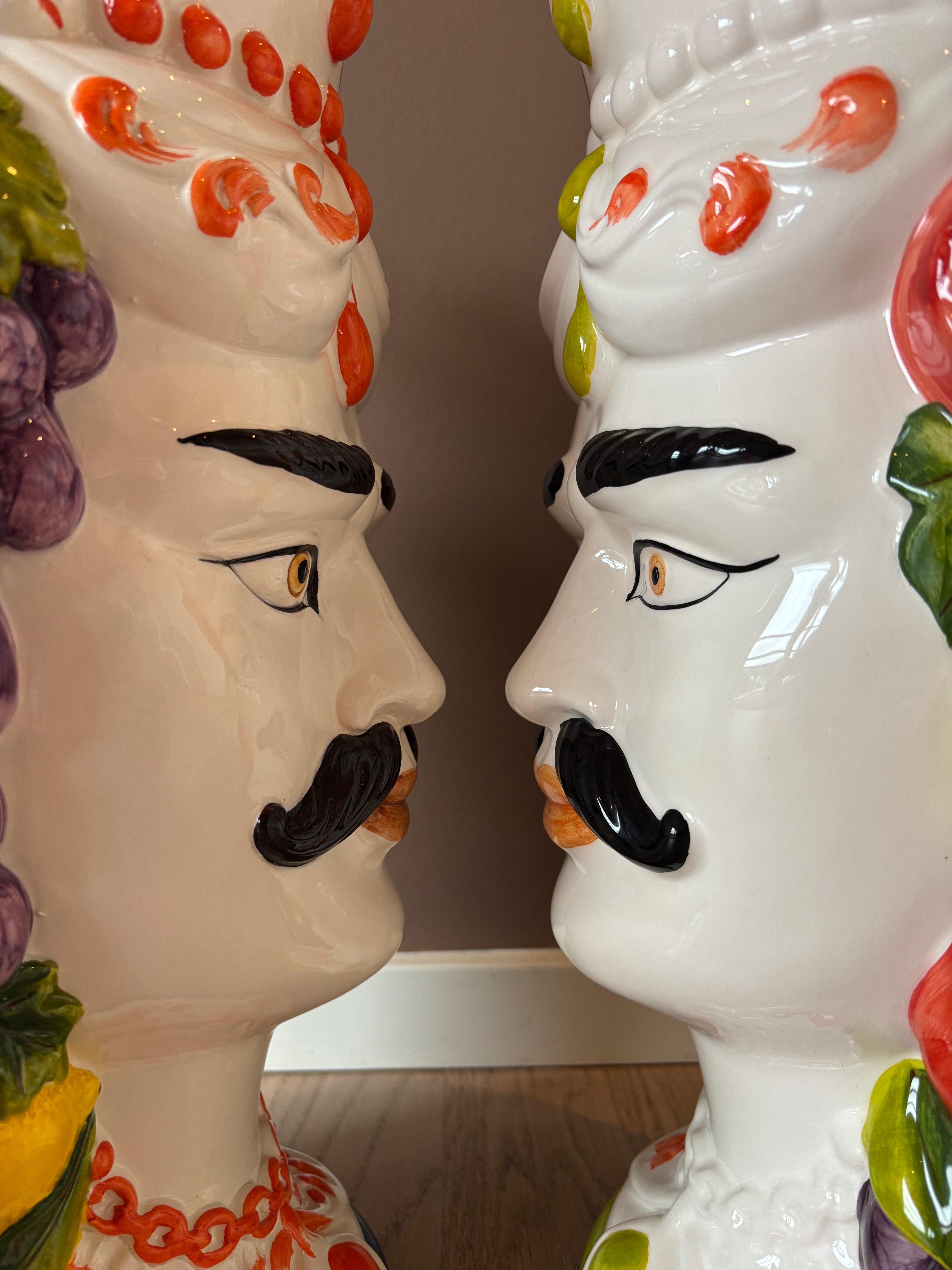 Le vase Testa Di Moro « Fruit Man » de 45 cm est une pièce d'artisanat sicilien authentique. Ce vase caractéristique, en forme de tête d'homme avec des fruits, est peint à la main selon les fières traditions céramiques italiennes qui remontent à 1965. Chaque vase est unique, avec de légères variations de couleur qui soulignent son caractère artisanal.
